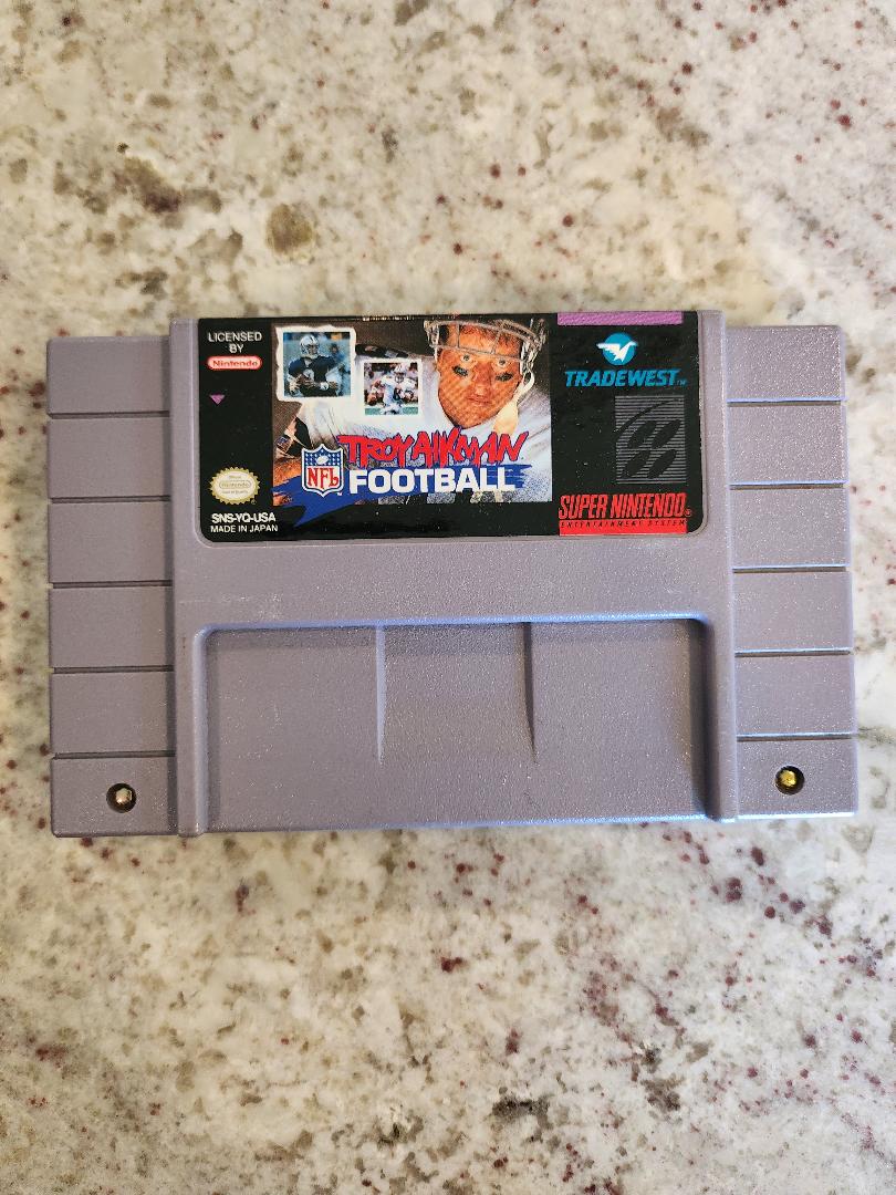Though Troy Aikman is the only real player mentioned by name in Troy Aikman<br>NFL Football, each of the 28 NFL teams in this game have been rated according to<br>position, based on stats from the '93-'94 season. You can play for or against any of the<br>teams in the Pre-Season mode, the '93-'94 Season mode, or the Custom Season mode,<br>which lets you design your own season or recreate a season from the NFL's past.<br>Regardless of the mode you decide to play, there are six field surfaces to choose from:<br>grass, mud, dirt, snow, rain, and artificial turf. An internal battery in the cartridge lets you<br>save pre-season or season career stats and return to any season in progress after you turn<br>off your SNES. <br><br>If you just want to coach, you can call all of the plays and let the computer run them.<br>Other options and features include: four different quarter lengths, penalties turned on or<br>off, a pre-game report, fair catches, five different running techniques, touch backs,<br>audibles, play-offs (including the Super Bowl), instant replay, time outs, and multiple<br>offensive and defensive plays.