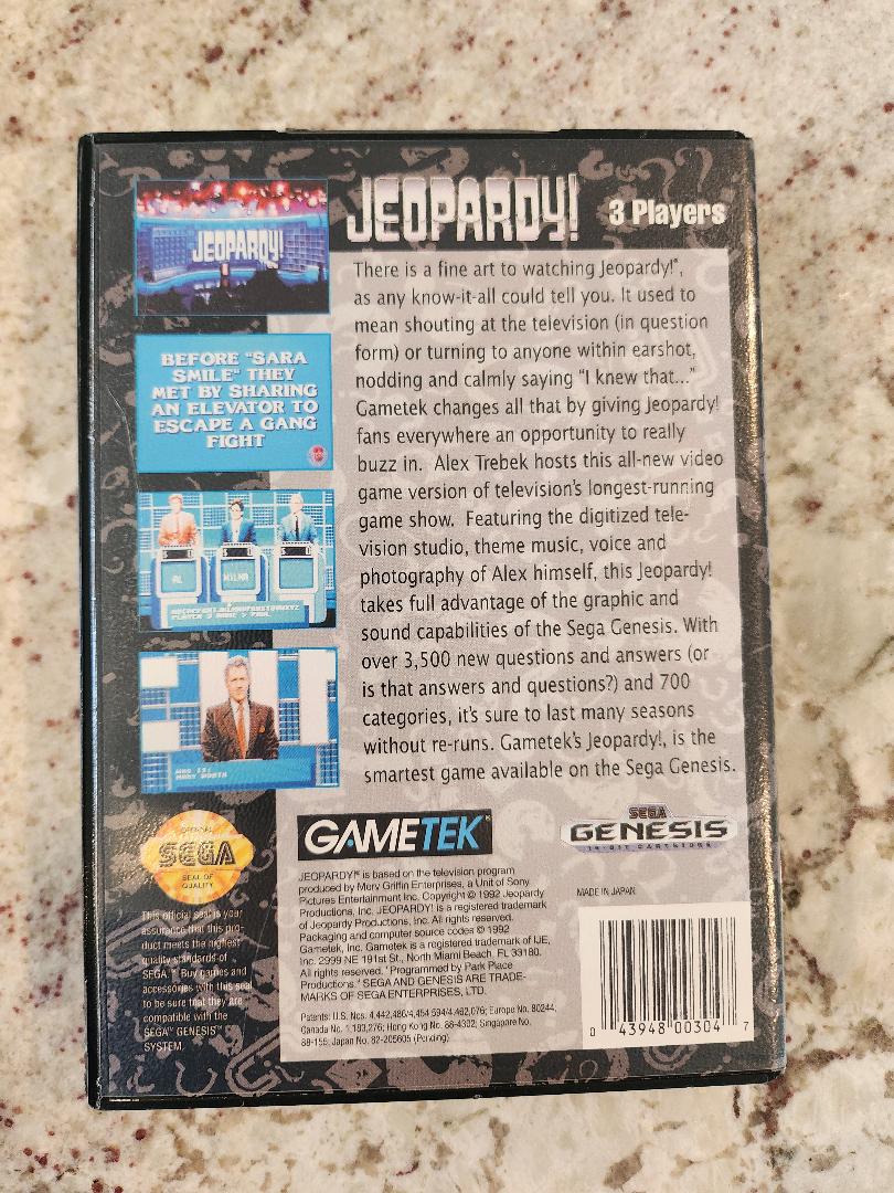 ¡Peligro! Ya no es una experiencia pasiva con esta traducción del popular programa de juegos para el Génesis. El juego sigue de cerca el formato del programa de televisión, lo que significa que tres jugadores deben competir para entrar y proporcionar la "pregunta" a la "respuesta" en la pantalla. Cada juego consta de dos rondas: Jeopardy! y Double Jeopardy!, que duplica el valor máximo de una pregunta a $1000.<br><br>En esta versión se han incluido más de 3500 preguntas y 700 categorías, con temas que van desde "Animales" hasta "Pesos y medidas". Completan el paquete auténticos efectos de sonido y temas musicales, una versión digitalizada del estudio de televisión y la voz y la imagen del presentador Alex Trebek. En 1993 se lanzó una edición de lujo de este juego con nuevas preguntas, categorías y jugadores animados.