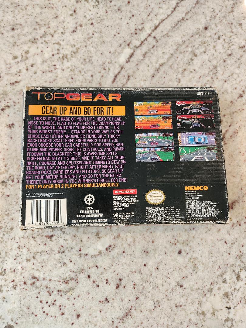 Malgré des graphismes de qualité inférieure et une conception de piste sans inspiration, Top Gear est un coureur tout-terrain agréablement stimulant (à nouveau) que les fans de Sega's Out Run apprécieront. Les joueurs sélectionnent l'une des quatre voitures améliorées par Nitro, chacune évaluée en fonction de la vitesse maximale, de la vitesse d'accélération, de l'adhérence des pneus et de la consommation de carburant. En plus de courir pour la vitesse, les joueurs doivent se soucier d'éviter les obstacles routiers et de s'arrêter pour faire le plein aux arrêts aux stands. Le but est de rouler sur 32 pistes dans huit pays différents. Qu'il soit joué seul ou avec un ami, le jeu offre un point de vue en écran partagé (haut et bas), ce qui permet des affichages individuels plus petits. La grandeur du jeu réside dans sa vitesse de type F-Zero et sa fréquence d'images incroyablement élevée. C'est l'un des coureurs 16 bits les plus rapides et les plus fluides du marché. Des effets sonores réalistes et une musique à indice d'octane élevé ajoutent au plaisir. <!--Réserver-->
