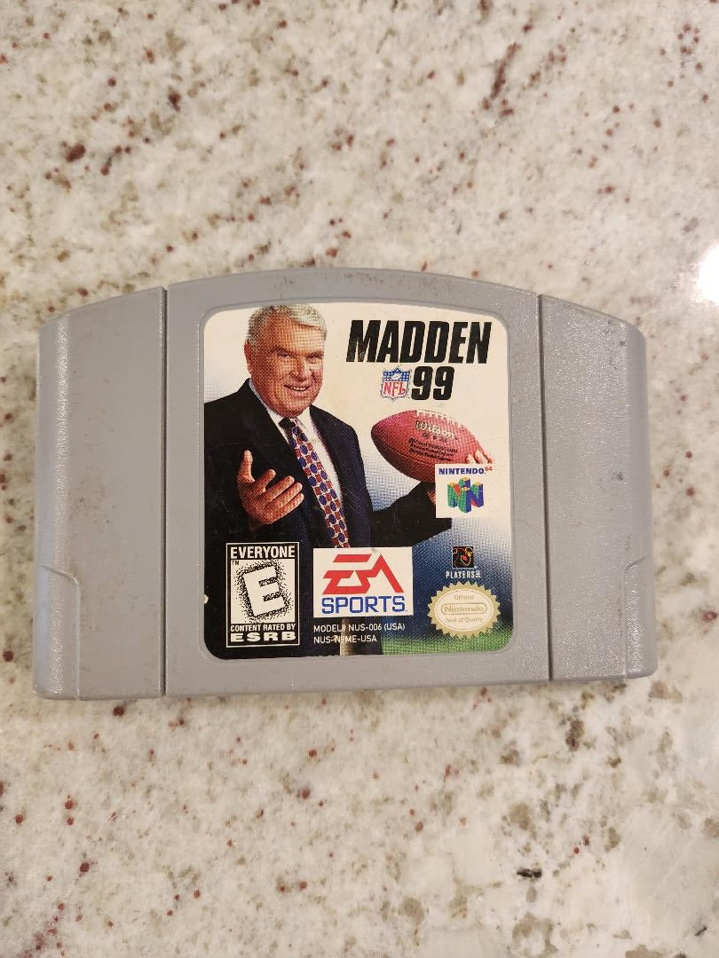 The second Madden release for the Nintendo 64 now features both NFL and NFLPA licenses, so teams will have authentic names, colors and logos in addition to the real players. Over 110 classic and modern NFL teams have been included with team-specific playbooks, but if you don't like the plays, you can assemble your own with the Custom Playbook option.<br><br>Madden NFL 99 also runs in the Nintendo 64's high-res mode for sharper 3D players and fields. One-Button Passing and Arcade options simplify the action for those new to the series, but seasoned players need not worry -- there is now a Franchise mode that will let you continue playing over multiple seasons. Other modes include Season, Exhibition, Custom Season, Practice and Tournament.<br><br>During franchise play, you'll need to make decisions on signing free agents or trading for that star player to carry your team into the millennium. You'll also have to worry about retirement, drafts and the omnipresent salary cap. Pat Summerall and John Madden have returned for commentary duties, and a new Play Editor lets you design your own secret weapon.<br><br>As with Madden 64, both statistics and season progress can be saved to Controller Pak. Anything else worth mentioning? How about a Fantasy Draft mode that enables you to form your own Dream Team! Madden NFL 99 supports up to four players simultaneously and is compatible with the Rumble Pak accessory to provide vibration feedback after every tackle.